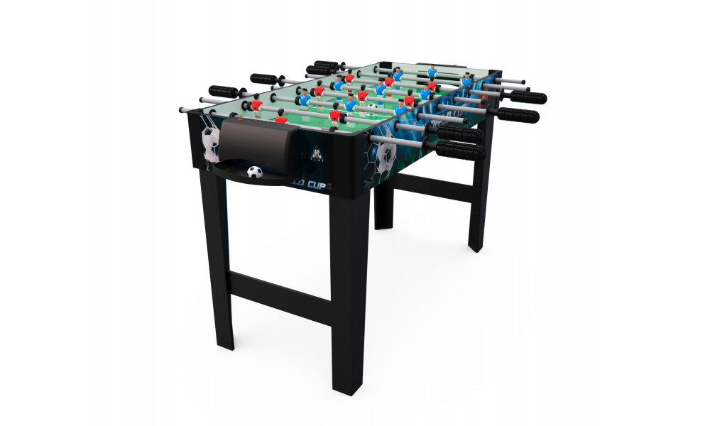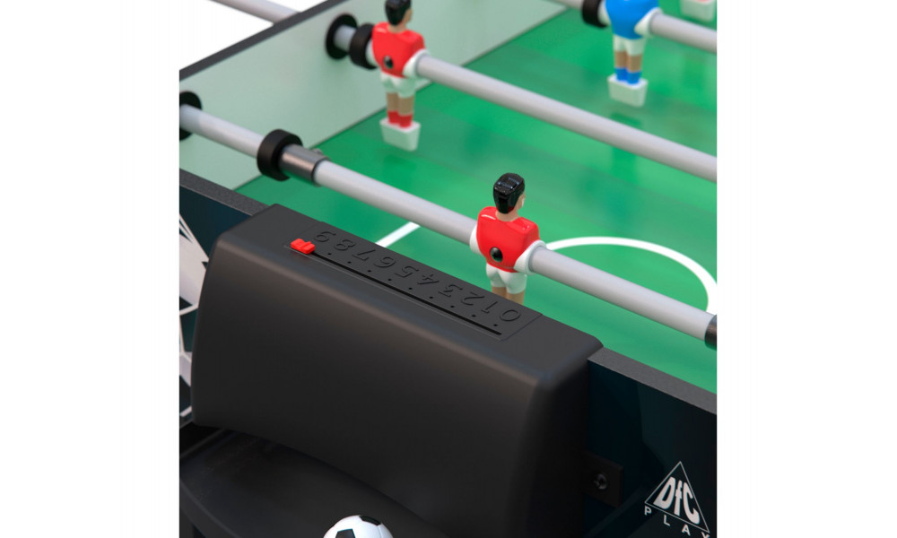 Игровой стол DFC WORLDCUP PRO с более широким игровым полем и утолщёнными стрежнями. Выполнен из прочного и долговечного материала – МДФ, который гарантирует стабильность и надежность конструкции. Толщина в 12 миллиметров со стороны игроков и 5 мм с боковых сторон обеспечивает прочность и устойчивость к повреждениям. Размеры бортиков: 80 х 11,6 х 1,2 см – с длинной стороны, а 45,6 х 11,6 х 1,2 см – с короткой. Ламинированное ПВХ покрытие игрового поля придает столу привлекательный вид и повышает его износостойкость. Размеры игрового поля составляют 77,5 х 45,5 сантиметров, что делает игру комфортной и захватывающей. В комплекте с настольным футболом вы получите два футбольных мяча, которые обеспечат реалистичность игры, и механический счетчик для подсчета очков. Утолщённые стержни диаметром 12,7 мм уже в сборе с игроками. Ножки толщиной 9 мм, перекладина между ножками толщиной 4,2 мм.
